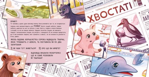 Книжка для дітей віком від 5 до 8 років, що вийшла у видавництві «Ранок», оповідає про життя тварин у контактних зоопарках, цирках, або коли їх використовують як реквізит для фотосесій. Лев, єнот, крокодил, порося та інші тварини дають інтерв’ю журналістці Сороці й розповідають, як вони почуваються.
