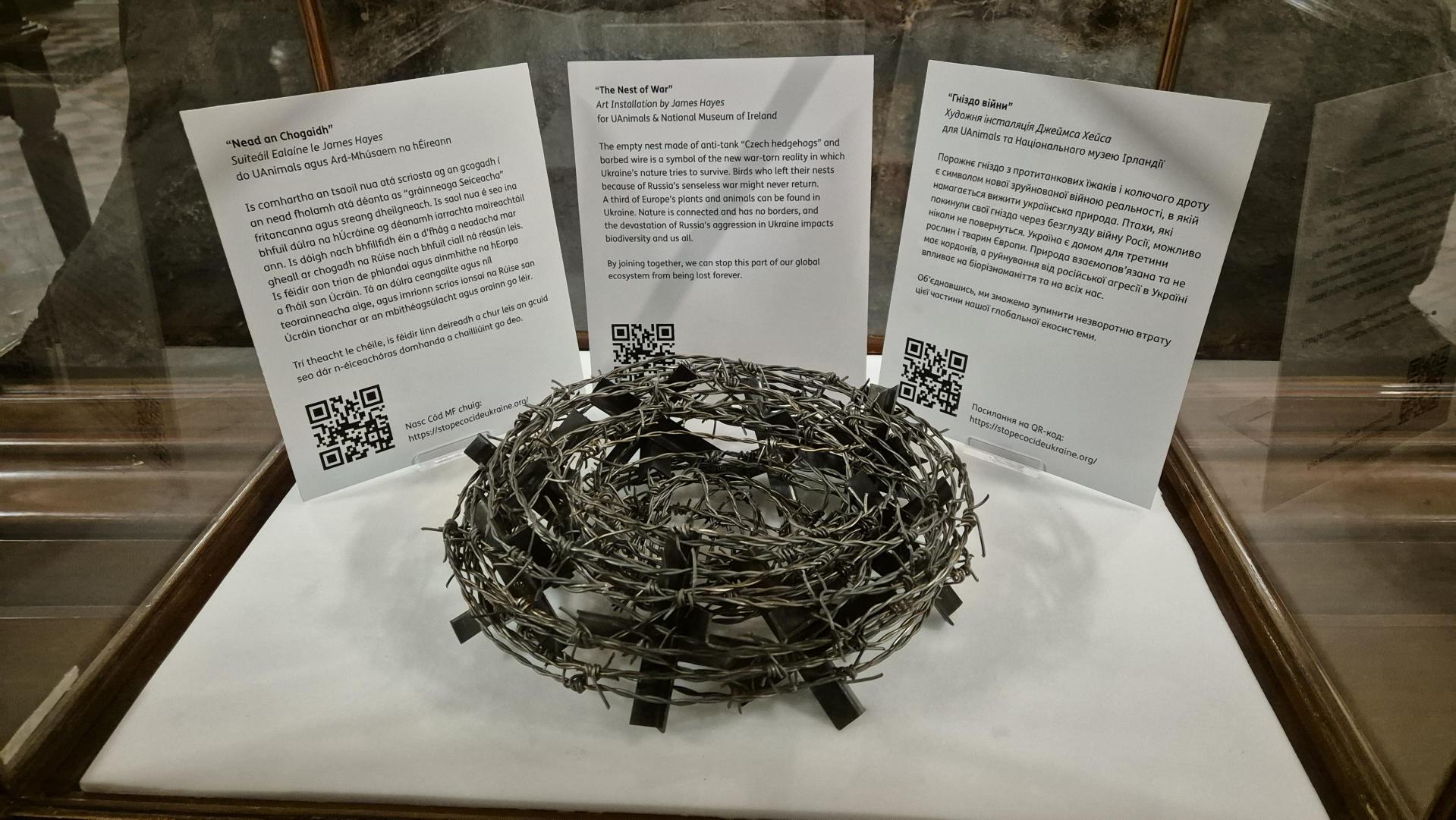 До експонатів природознавчого Національного музею Ірландії додалася інсталяція «Гніздо війни»: вона розповідає відвідувачам про екологічні наслідки війни в Україні. Скульптуру — гніздо з колючого дроту й символічних протитанкових їжаків – створив ірландський митець Джеймс Хейс у співпраці з UAnimals.