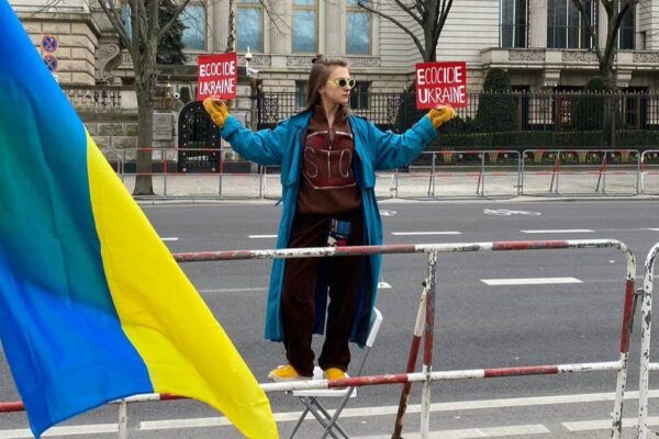 «Трохи хвилювалася, щоб не перестаратися з перформансом, — розповідає Ольга. — Не знайшлося підходящого знака, щоб клеїти стікери, натомість знайшлися херсонські хлопці з українськими піснями під російським посольством. Екоцид — одне з найбільш нагальних питань у моїх роздумах, постійно намагаюся діяти».