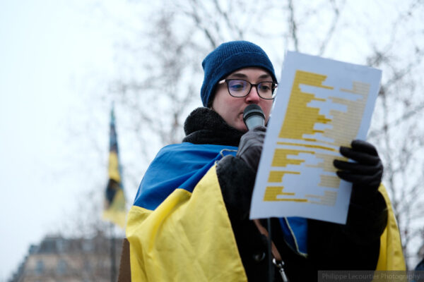 Президент обʼєднання українців у Франції та український експат у другому поколінні Жан-Пʼєр Пастернак був основним спікером події. Передусім він закликав активістів і активісток провести хвилину мовчання — це традиція на регулярних акціях Union des Ukrainiens de France для вшанування пам’яті полеглих українських героїв і геройок.